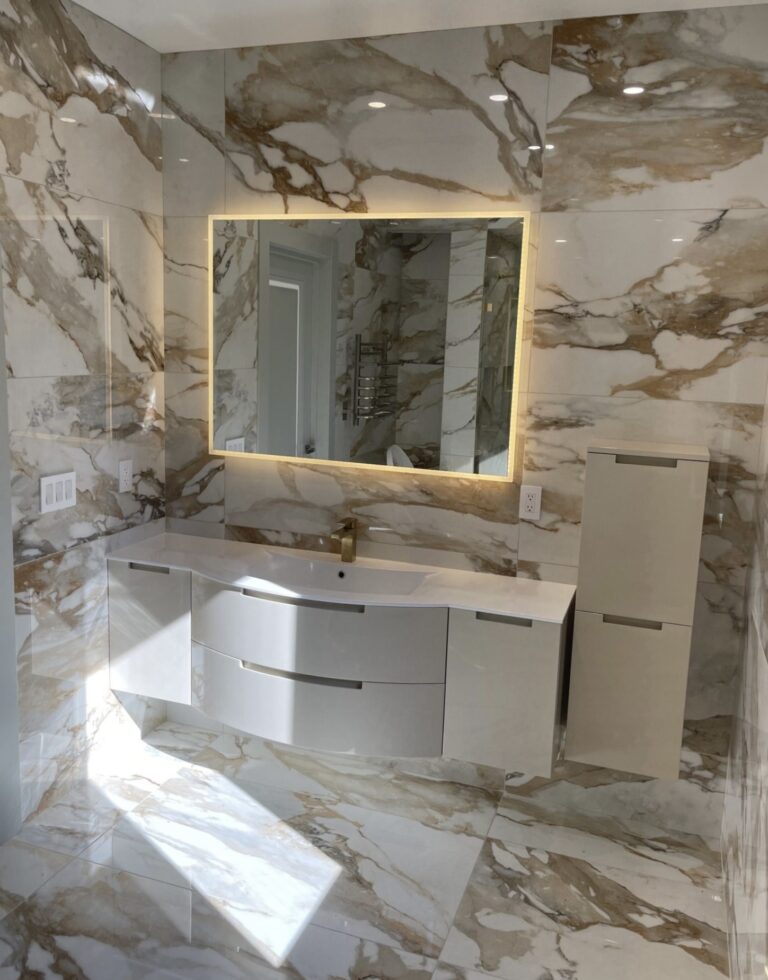 This bathroom renovation brings together calming neutrals and soft lighting to craft a soothing oasis perfect for unwinding at any time of day.