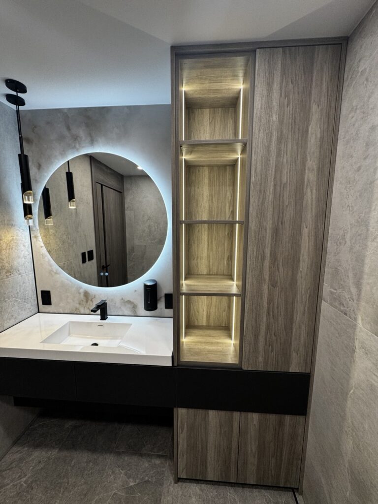 This bathroom reimagines daily routines as moments of calm, blending soft textures, natural materials, and warm lighting to create a peaceful, spa-like retreat.